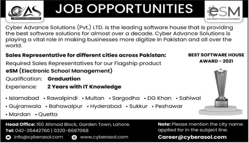 Cyber Advance Solutions Pvt Limited requires the services of experienced and field professional individuals for the positions of Sales Representatives in Islamabad, Rawalpindi, Multan, Sargodha, DG Khan, Sahiwal, Gujranwala, Bahawalpur, Hyderabad, Sukkur, Peshawar, Mardan & Quetta.