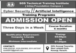 SOS Teaching has announced admissions 2025 for Cyber Security, AI. Students can enroll for admissions in SOS Teaching Karachi Sindh Pakistan for academic year 2025 to continue campus based or online education in Computer Course. Students who want to enroll for academic session 2025 in qualification and admission criteria for Private institute can apply till last date Read newspaper ad for exact details.