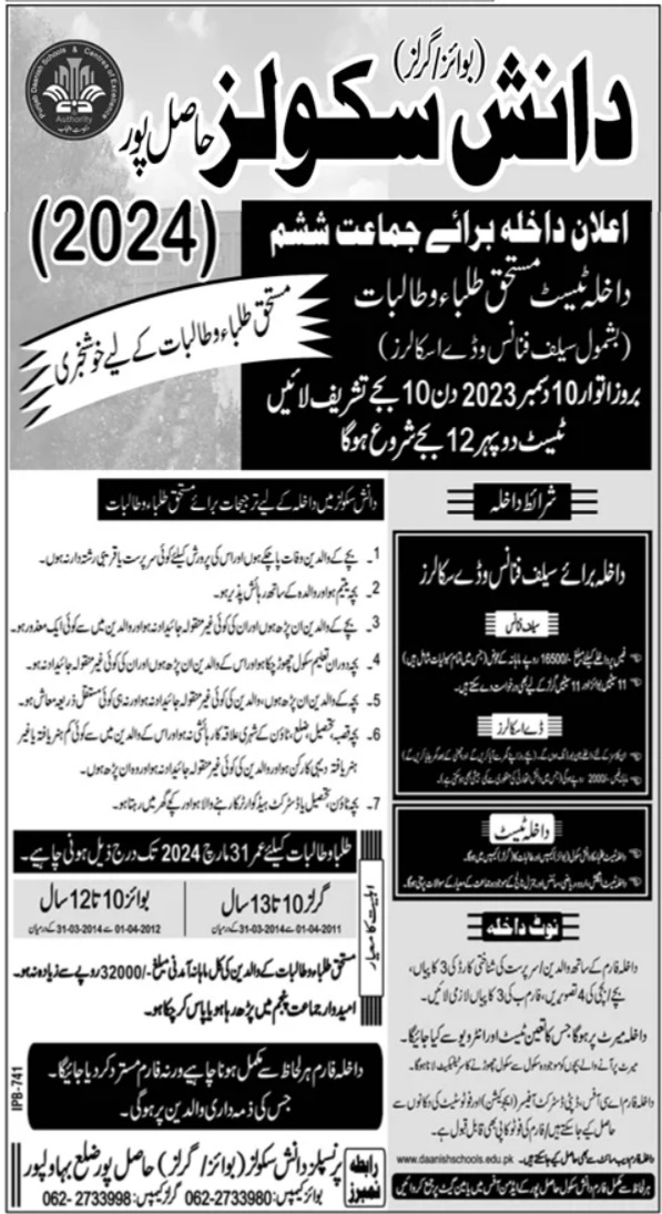 Daanish Schools 6th Class admissions 2023 has been started. Daanish Schools Hasilpur Punjab Pakistan welcomes students to apply for admissions in academic year 2023 in Science School. Students for admissions in Middle can apply for online or campus classes as per Government institute criteria till admission closing date December 10, 2023. Read newspaper ad for exact details.