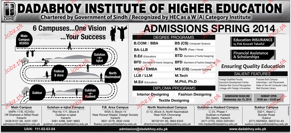 Dadabhay Institute of Higher Education Admission BBA, LLB, BFD, LLM, BS, BFD, MS and M-Tech in Karachi Read newspaper ad for exact details.