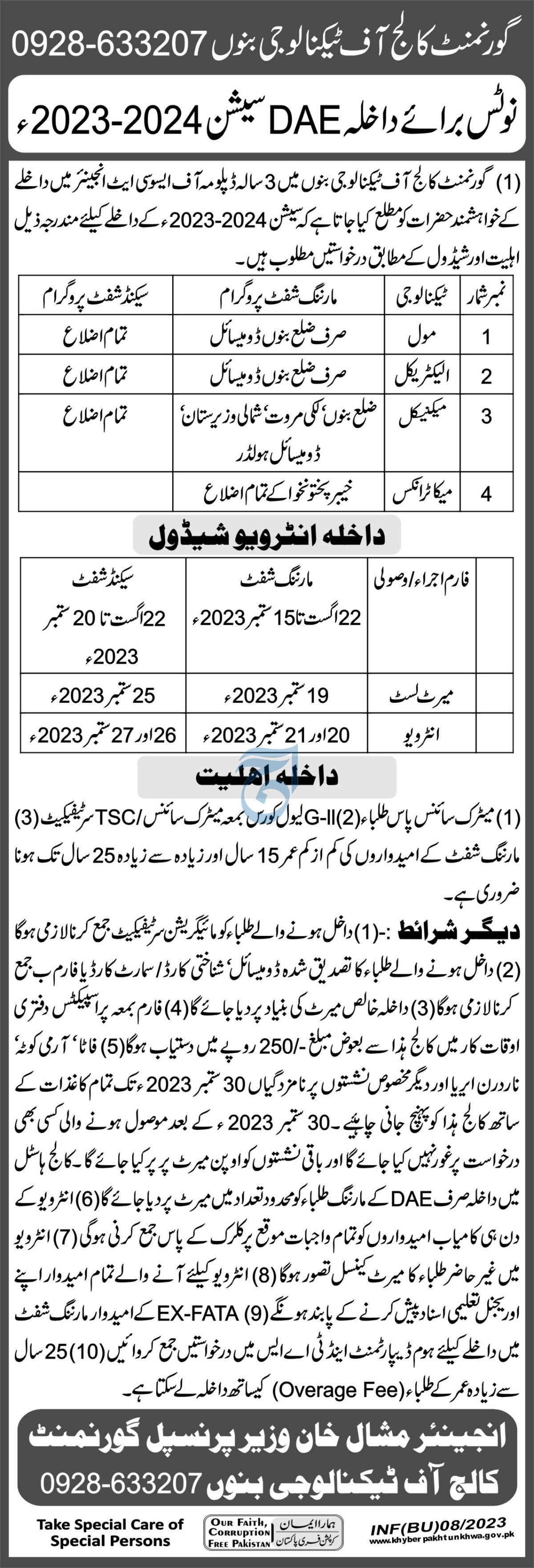 Government College of Technology has announced admissions 2023 for DAE Civil, DAE Electrical, DAE Mechanical, DAE Mechatronics. Students who want to take admissions in Government College of Technology Bannu Khyber Pakhtunkhwa KPK Pakistan for academic year 2023 to continue education in Technical Diploma can apply. Students for admissions in DAE & criteria can apply as per Government institute admission policy 2023 before closing date September 30, 2023 as per advertisement. Read newspaper ad for exact details.
