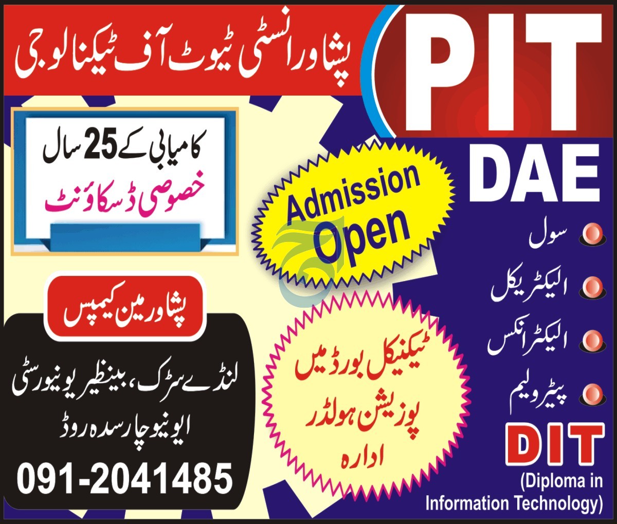 Peshawar Institute of Technology PIT DAE Civil, DAE Electrical, DAE Electronics, DAE Petroleum, DIT admissions 2023 has been announced. Peshawar Institute of Technology PIT Peshawar Khyber Pakhtunkhwa KPK Pakistan welcomes students to apply for admissions in academic year 2023 in Technical Diploma. Students who want to enroll for academic session 2023 in DAE and DIT qualification and admission criteria for Private institute can apply till last date 29 November 2023. Read newspaper ad for exact details.