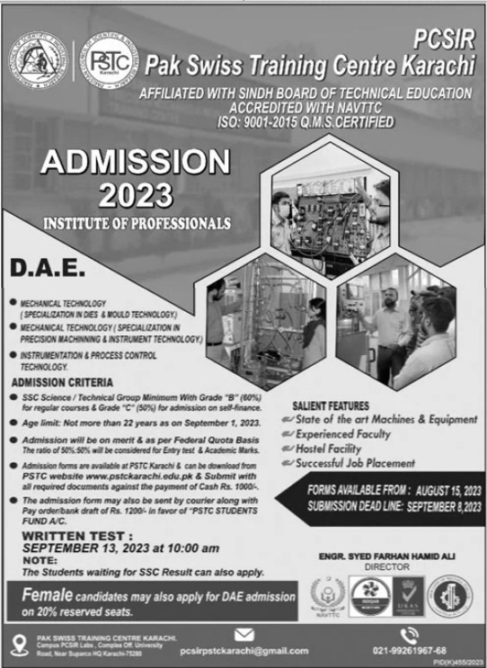 Admissions in Pak Swiss Training Center 2023 for DAE Mechanical Technology, DAE in Instrumentation and Process Control Technology has been announced. Pak Swiss Training Center Karachi Sindh Pakistan welcomes students to apply for admissions in academic year 2023 in Technical Diploma. Eligible candidates for admissions in DAE can apply as per Private institute criteria and before closing date 8 September 2023 after reading advertisement online. Read newspaper ad for exact details.