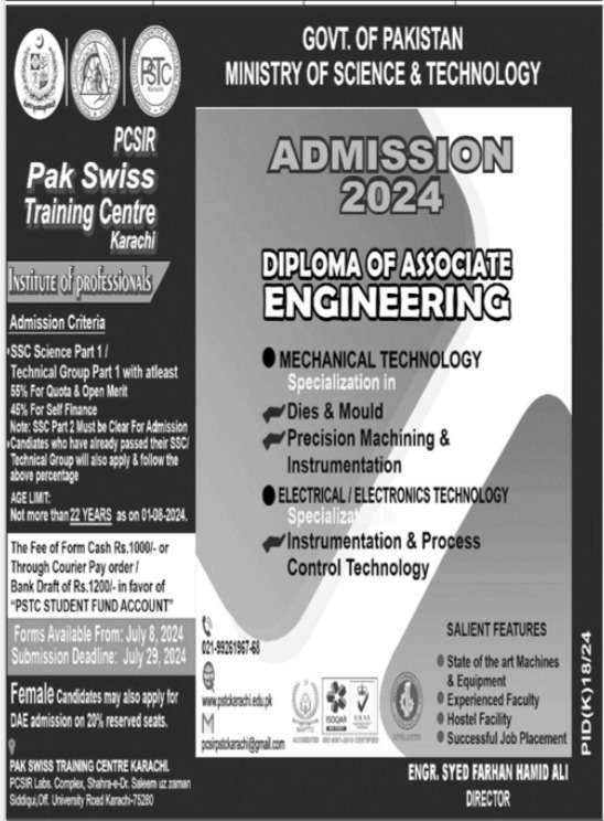 Pak Swiss Training Center has announced admissions 2024 for DAE Programs. Students who want to take admissions in Pak Swiss Training Center Islamabad Islamabad Pakistan for academic year 2024 to continue education in Teaching Diploma can apply. Eligible candidates for admissions in DAE can apply as per Government institute criteria and before closing date 29 July 2024 after reading advertisement online. Read newspaper ad for exact details.