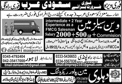 Dahlawi Manpower Recruiting Riyadh, riyadh Saudi Arabia invites applications from eligible candidates for the post of van salesman as per advertisement of December 4, 2022 published in daily Express Newspaper. Preferred Education is Intermediate and Matric etc.