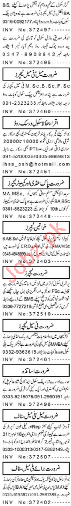 Qualified and well educated individuals for the posts of Nursery Teacher, Subject Teacher, Urdu Teacher, Qari, English Teacher, Chemistry Teacher, Pakistan Study Teacher, Computer Teacher and Mathematics Teacher required for private schools in Peshawar KPK 2019.