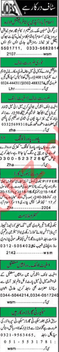 Male/ Female Executives, Salesman, Female Marketing Staff, Sales Staff, Computer Operator, Sales Manager, Receptionist, HR Officer, Supervisor, Assistant Supervisor, Account Manager, Office Assistant, Receptionist, Clerk, Naib Qasid, Watchman, Sanitary Worker, Security Guard, Driver, HTV Driver, LTV Driver, Teacher and Pharmacist required in well progressive companies.