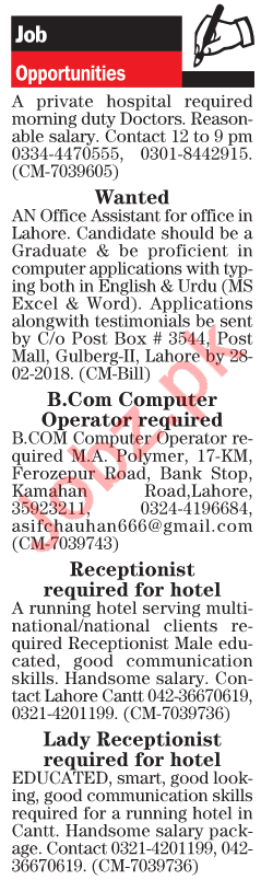 A well progressive companies located in Lahore seeks candidates for the posts of Supervisor, Assistant Supervisor, Account Manager, Office Assistant, Receptionist, Clerk, Naib Qasid, Watchman, Sanitary Worker, Security Guard, Driver, HTV Driver, LTV Driver, Teacher and Male/ Female Nurses.