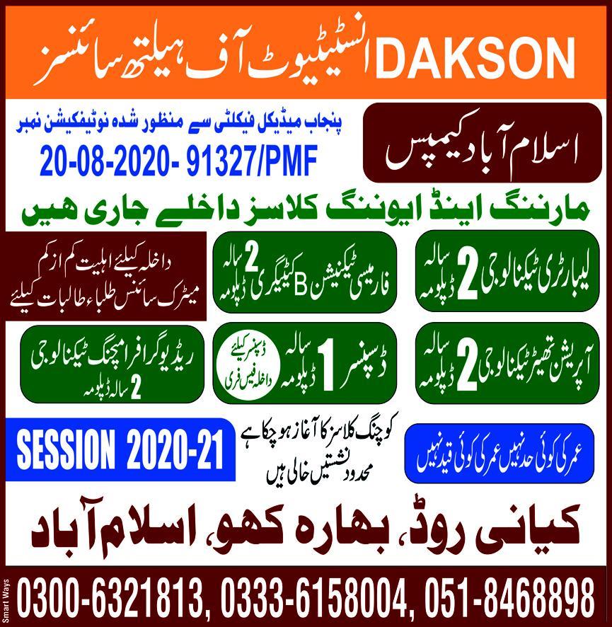 DAKSON Institute of Health Sciences Islamabad Campus has announced admissions for diploma in Laboratory Technology, Pharmacy Technician, Operation Theater Technology, Dispenser, Radiography Imaging Technology. Read newspaper ad for exact details.
