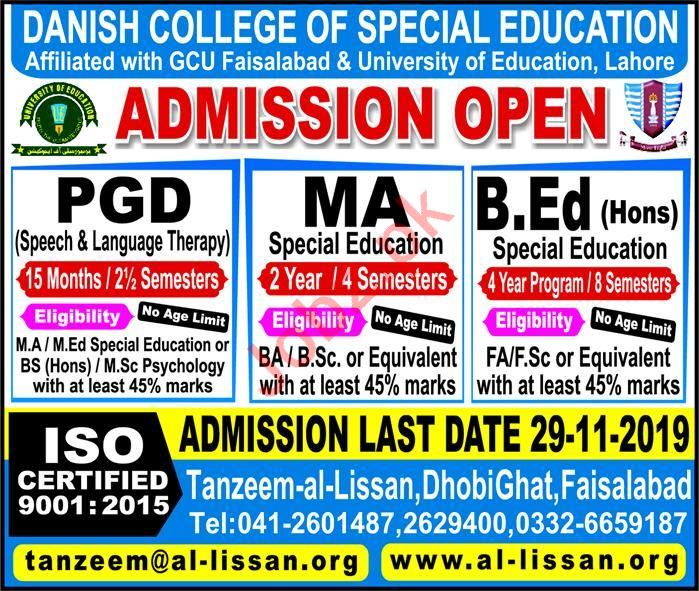 Danish College Of Special Education affiliated with GCU Faisalabad and University of Education Lahore, an Private Education Institute in Faisalabad is offering admission in the programs PGD, MA and B.Ed. Read newspaper ad for exact details.