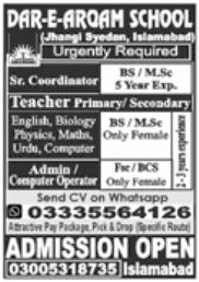 Dar e Arqam Schools Pakistan admissions 2024 for Playgroup to Matric has been announced. Students who want to take admissions in Dar e Arqam Schools Pakistan Islamabad Islamabad Pakistan for academic year 2024 to continue education in Teaching School can apply. Students who want to enroll for academic session 2024 in Primary, Middle and Matric qualification and admission criteria for Private institute can apply till last date 31 August 2024. Read newspaper ad for exact details.