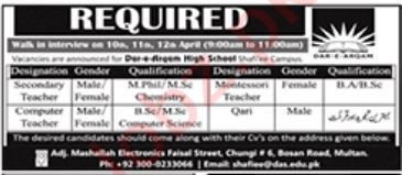 Dar e Arqam School is looking for candidates for following posts as per job advertisement published in daily Jang Newspaper of April 9, 2023 for location Multan, multan Punjab Pakistan: