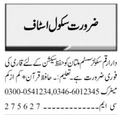 Vacant posts including qari and quran teacher are announced in Dar e Arqam Schools Pakistan Multan, multan Punjab Pakistan as per 16 December 2022 advertisement in daily Jang Newspaper. Matric and Intermediate etc. educational qualification will be preferred.