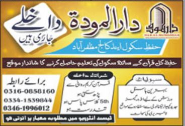 Admissions in Dar ul Mawaddat Hifz School & College 2022 for Hifz ul Quran, Class 5th to Matric has been announced. Students can enroll for admissions in Dar ul Mawaddat Hifz School & College Muzaffarabad AJK Pakistan for academic year 2022 to continue campus based or online education in Other School. Eligible candidates for admissions in Primary, Matric, Course and Middle can apply as per Private institute criteria and before closing date 25 April 2022 after reading advertisement online. Read newspaper ad for exact details.