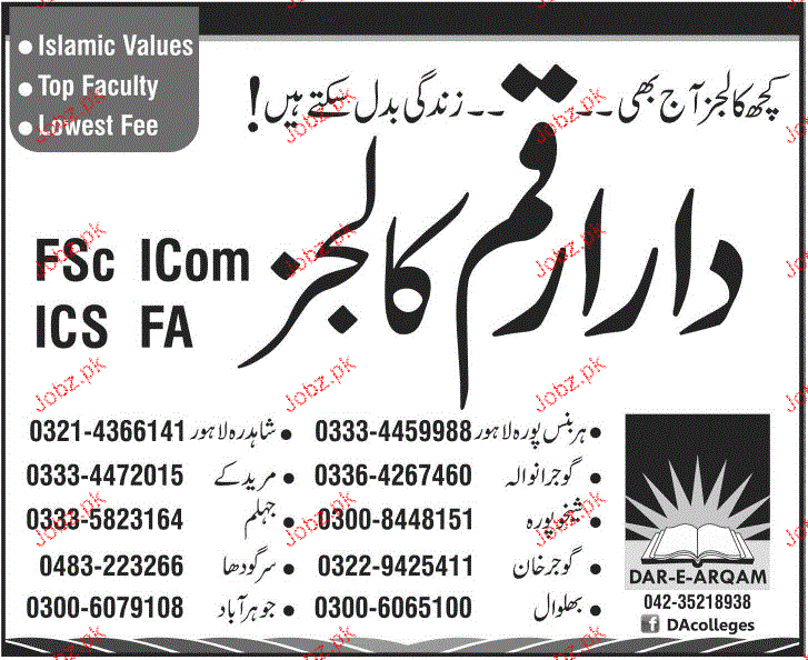 Dara-e-Arqam Colleges Admission in Fsc, ICom and FA in Jhelum. Read newspaper ad for exact details.