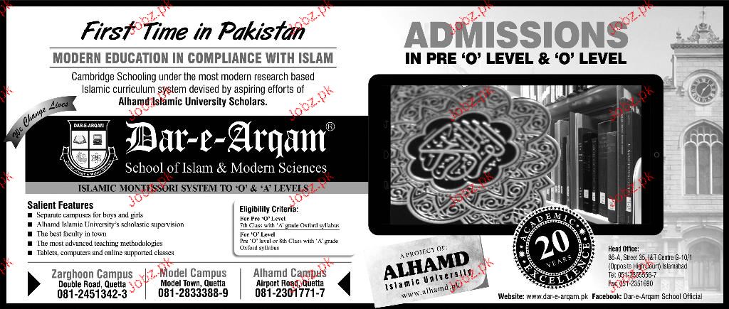 Dara e Arqam School of Islam & Modern Science Admission in O Level in Quetta. Read newspaper ad for exact details.