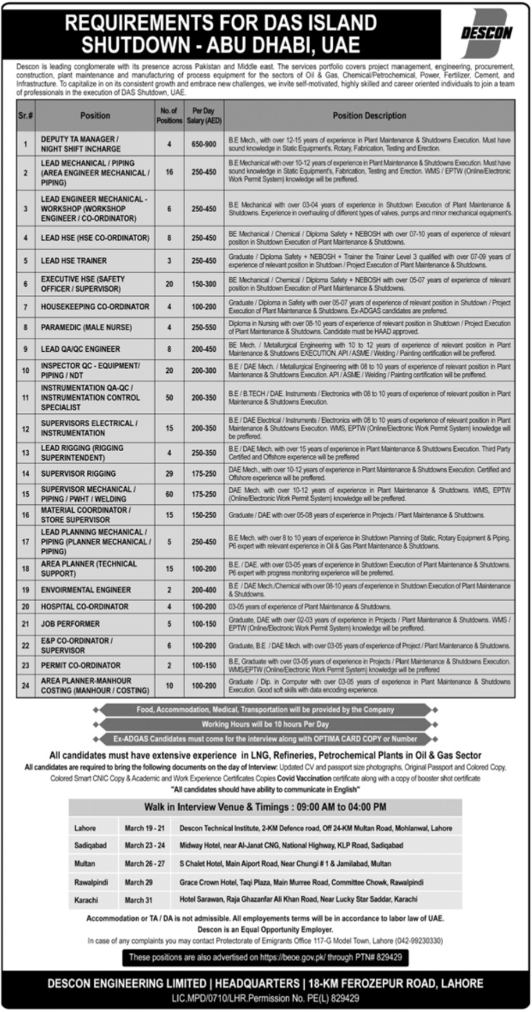 Descon Engineering Limited is looking for candidates for following posts as per job advertisement published in daily Jang Newspaper of March 7, 2022 for location UAE UAE: