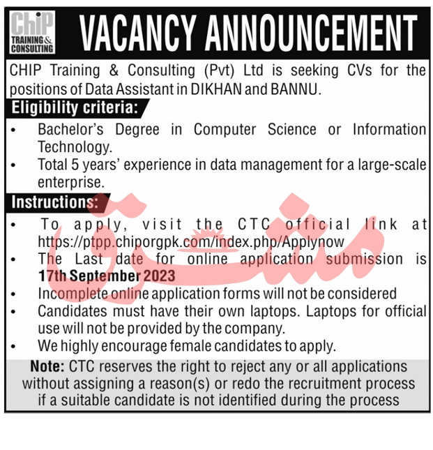 CHIP Training & Consulting Pvt Ltd Dera Ismail Khan, bannu and dera ismail khan Khyber Pakhtunkhwa KPK Pakistan invites applications from eligible candidates for the post of data assistant as per advertisement of September 15, 2023 published in daily Mashriq Newspaper. Educational qualifications required BIT and BCS etc.