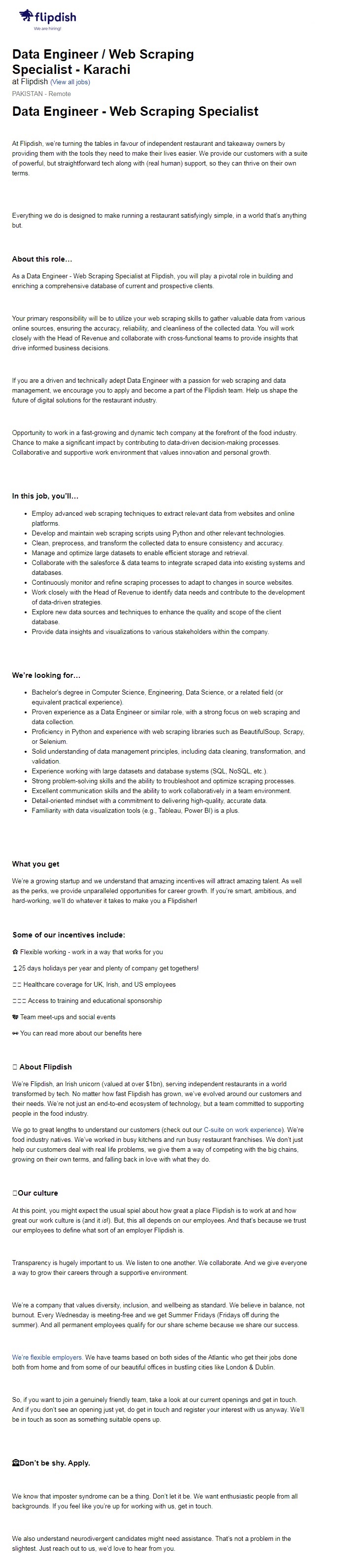 Vacant posts including web scraping specialist and data engineer are announced in Flipdish Karachi, karachi Sindh Pakistan as per 23 September 2023 advertisement in daily Other Newspaper. Preferred Education is Bachelor and Master etc.
