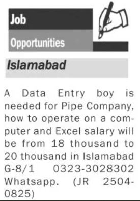 Private Company invites applications for job positions advertised in daily The News dated 26 April 2025 for following vacancies in G-8/1 Islamabad, islamabad Islamabad Pakistan.