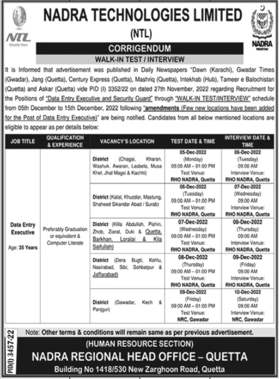 Nadra Technology Limited NTL is looking for candidates for following posts as per job advertisement published in daily Jang Newspaper of December 3, 2022 for location Chaghi, sohbatpur, jafarabad, killa saifullah, lasbela, ziarat, kachhi, loralai, kalat, khuzdar, mastung, zhob, panjgur, pishin, chaghi, dera bugti, naseerabad, quetta, kohlu, killa abdullah, kech, kharan, sibi, duki, washuk, gwadar and awaran Balochistan Pakistan: