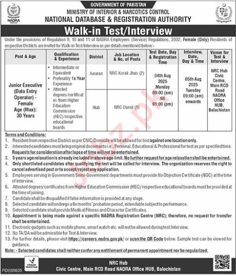 Latest Government walk in interview jobs in National Database & Registration Authority NADRA in Data Entry and others can be applied till 5 August 2025 or as per closing date in newspaper ad. Read complete ad online to know how to apply on latest National Database & Registration Authority NADRA job opportunities.