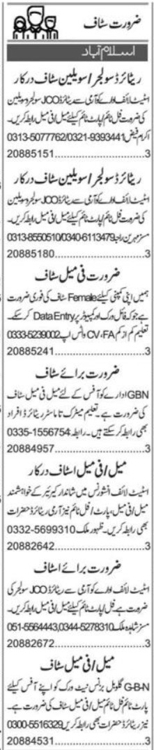 Vacant posts including management staff, male female staff, retired soldier, state life insurance staff, office staff, retired jco and female data entry operator are announced in Private Islamabad, islamabad Islamabad Pakistan as per 2 February 2023 advertisement in daily Express Newspaper. Preferred Education is Intermediate, Matric, Bachelor, Master and Middle etc.