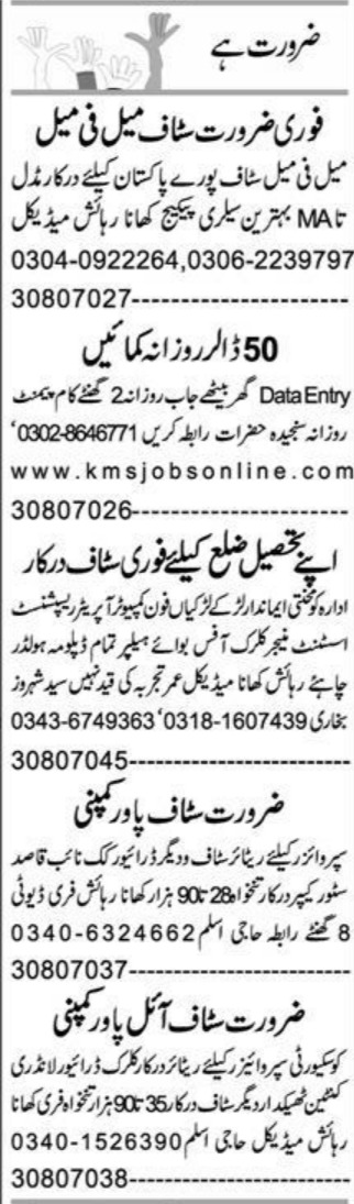 Vacant posts including supervisor, helper, data entry operator, assistant manager, office boy, naib qasid, clerk, office staff, cook, computer operator, driver, receptionist and store keeper are announced in Private Company Peshawar, peshawar Khyber Pakhtunkhwa KPK Pakistan as per 23 February 2022 advertisement in daily Khabrain Newspaper. Preferred Education is Middle, Matric, Bachelor and Intermediate etc.