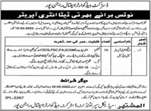 District Headquarter Hospital DHQ Rajanpur, rajanpur Punjab Pakistan invites applications from eligible candidates for the post of data entry operator as per advertisement of March 2, 2022 published in daily Nawaiwaqt Newspaper. Persons with I.com and Intermediate etc. education can apply.