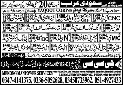 Vacant posts including helper, store keeper, welder, industrial electrician, co2 welder, n welder, electrician, general factory worker, data entry operator, gas welder, meg welder, 3g welder, auto painter, short fork lift operator, fabricator, auto electrician, qc inspector, cnc operator, short lift, material coordinator and building electrician are announced in GCC Techni Test & Training Center Riyadh, makkah Saudi Arabia as per 20 May 2023 advertisement in daily Express Newspaper. Educational qualifications required Bachelor, BA, Intermediate, Matric, DAE and B.E etc.
