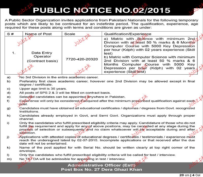 Data Entry Operators are required in Public Sector in Deara Ghazi Khan.