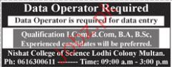 Latest Nishat College of Science Data Entry Posts Multan 2025