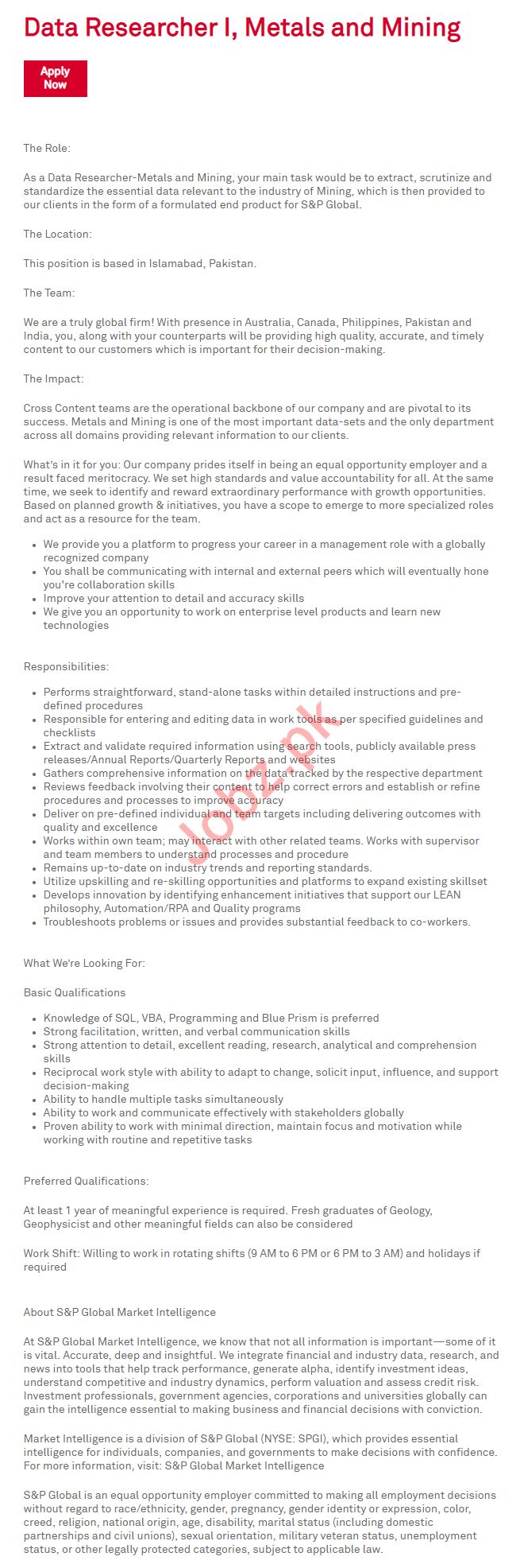 Vacancies in S&P Global Pakistan Advertisement May 2019