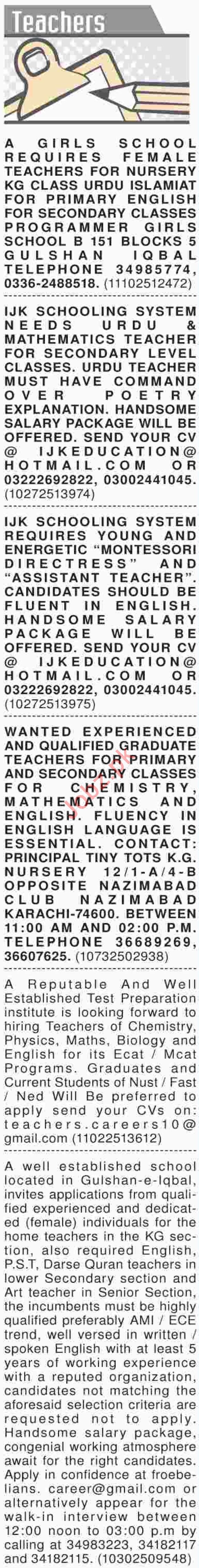 Qualified and well educated candidates for the posts of Nursery Teacher, English Teacher, Mathematics Teacher, Secondary Teacher, Urdu Teacher, Montessori Directress, Assistant Teacher, Chemistry Teacher, Biology Teacher, Physics Teacher, Academic Coordinator, Economic Teacher, Principal, Librarian, Arts Teacher, Pak Studies Teacher, Computer Teacher, Science Teacher required for a leading private schools in Karachi.