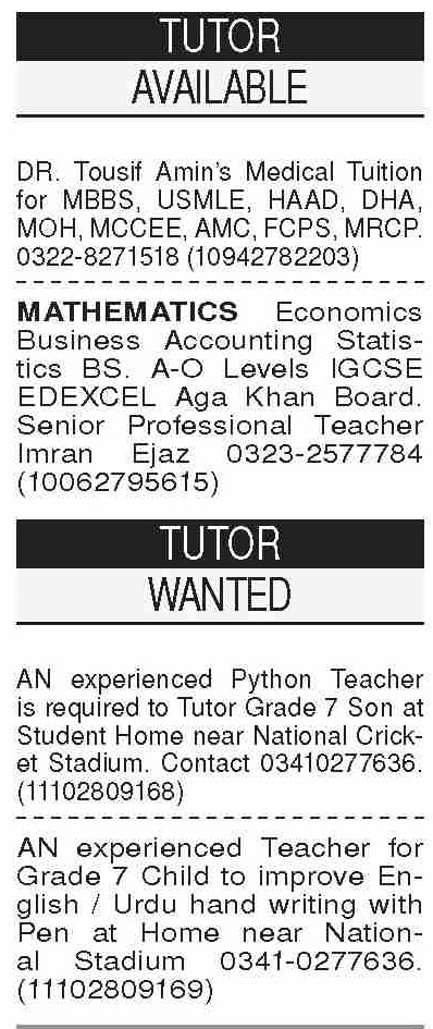 Academy jobs advertisement dated about 2 June 2025 in daily Dawn Newspaper invites application for the vacant post of a level teacher, o level teacher, accounting teacher, teacher, mathematics teacher, economics teacher, tutor and home tutor in Karachi, karachi Sindh Pakistan. Preferred Education is Master and Bachelor etc.
