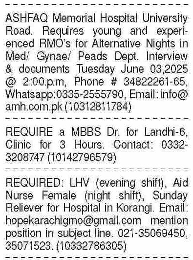 Dawn Sunday Classified Ads 1 June 2025 For Hospital Staff