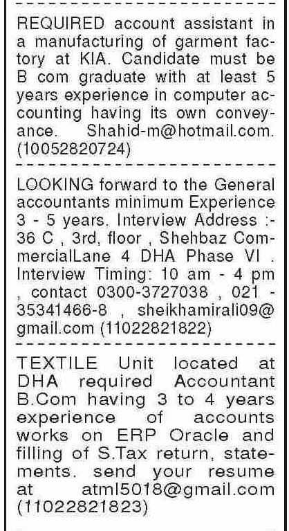 Private Company DHA Phase 4 Karachi, karachi Sindh Pakistan invites applications from eligible candidates for the post of general accountant, accounts officer, account assistant and accountant as per advertisement of August 11, 2025 published in daily Dawn Newspaper. Educational qualifications required Others, B.com, BBA, Bachelor and BA etc.