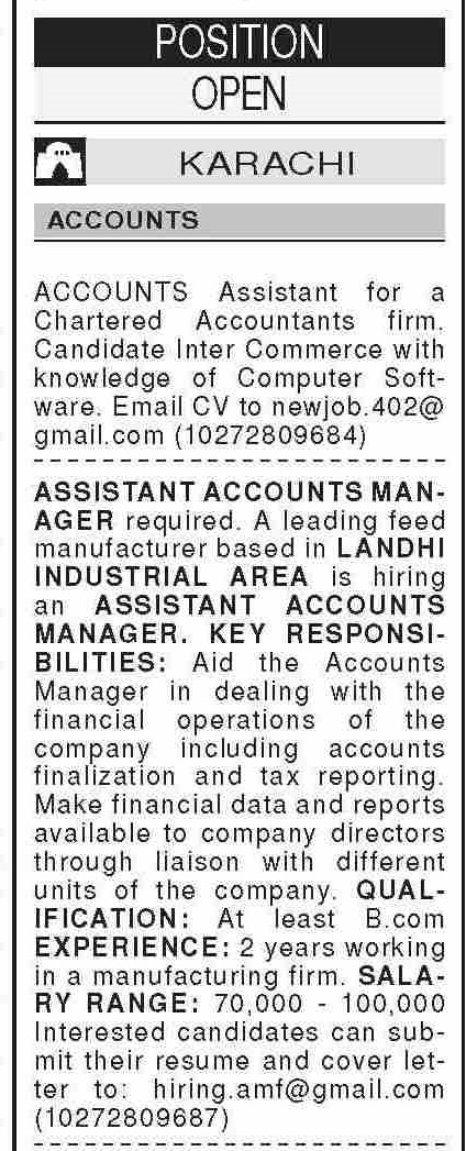 Accountancy Firm Korangi Industrial Area Karachi, karachi Sindh Pakistan invites applications from eligible candidates for the post of accountant, accounts assistant and assistant accounts manager as per advertisement of August 11, 2025 published in daily Dawn Newspaper. Persons with ACCA, B.com, Bachelor, Others and BBA etc. education can apply.