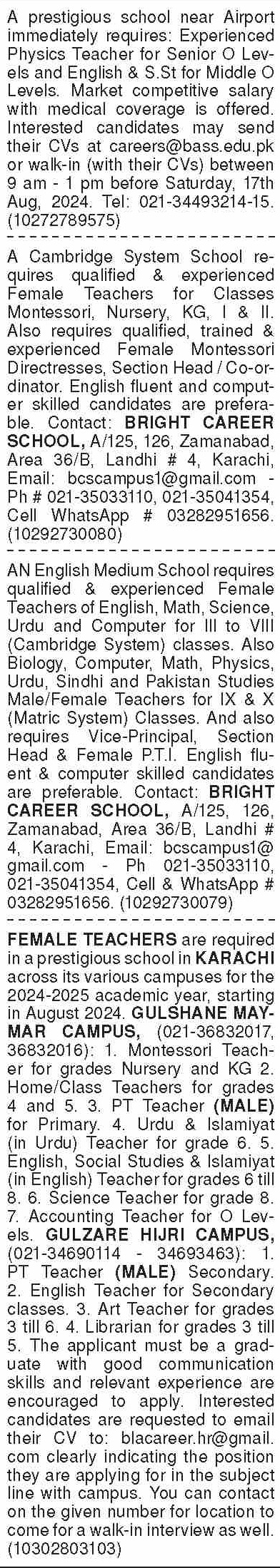 Private School invites applications for job positions advertised in daily Dawn dated 12 August 2024 for following vacancies in Karachi, karachi Sindh Pakistan.