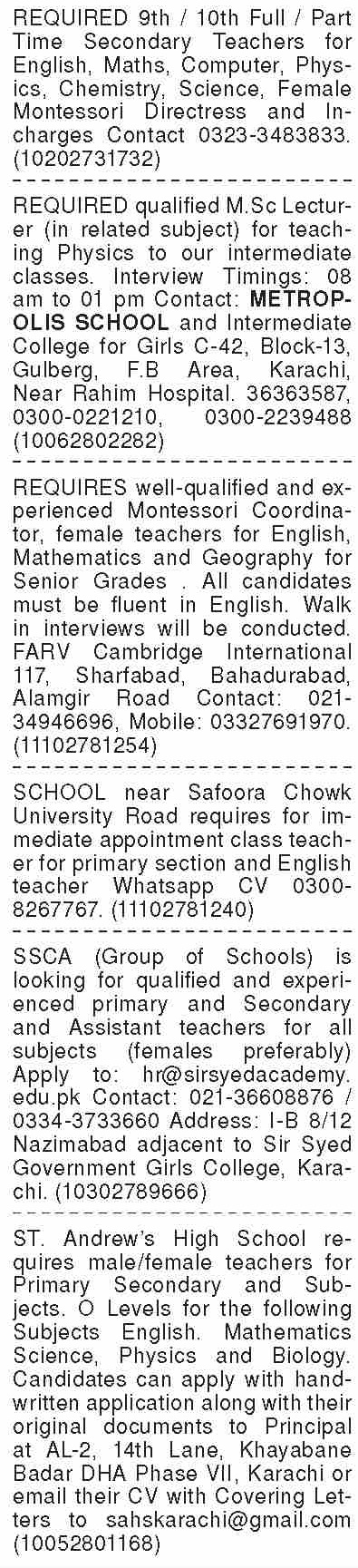 Dawn Sunday Classified Ads 11 Aug 2024 For Teachers