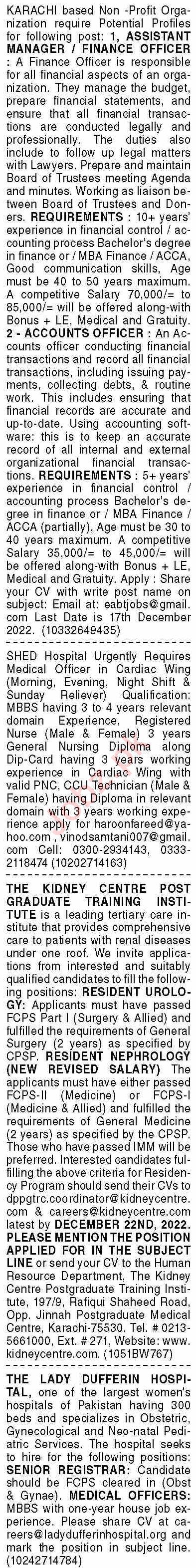 Dawn Sunday Classified Ads 11 Dec 2022 For Medical Staff
