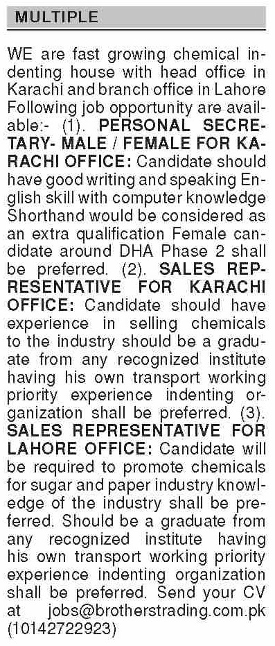 Latest Secretarial jobs and others Classifieds jobs in Chemical Company closing date is around March 24, 2024, see exact from ad. Read complete ad online to know how to apply on latest Chemical Company job opportunities. Learn today extra skills including Sales Management and Secretarial to get these Chemical Company jobs.