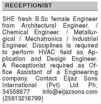 Engineering Company Karachi, karachi Sindh Pakistan invites applications from eligible candidates for the post of design engineer, chemical engineer, industrial engineer, receptionist, office assistant, architectural engineer, engineer, mechatronics engineer, metallurgical engineer, female engineer and application engineer as per advertisement of February 12, 2024 published in daily Dawn Newspaper. BA, Bachelor, B.E and Intermediate etc. educational qualification will be preferred.