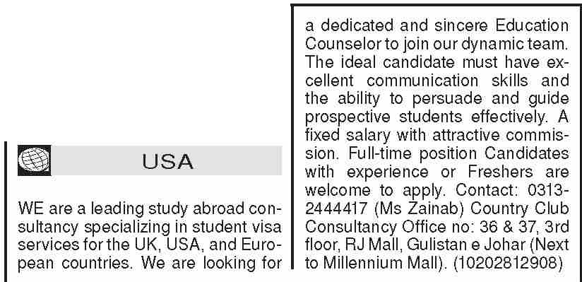 Education Consultancy Firm jobs advertisement dated about 12 May 2025 in daily Dawn Newspaper invites application for the vacant post of education counselor in Gulistan-e-Jauhar Karachi, karachi Sindh Pakistan. Candidates with Intermediate, BA and Bachelor etc. educational background will be preferred.