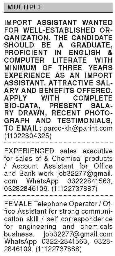 Vacant posts including account assistant, telephone operator, sales executive, import assistant and office assistant are announced in Private Company Karachi, karachi Sindh Pakistan as per 13 January 2025 advertisement in daily Dawn Newspaper. ACCA, Bachelor, Matric, Intermediate, BBA and B.com etc. educational qualification will be preferred.
