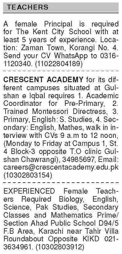 Dawn Sunday Classified Ads 12 Jan 2025 For Teaching Staff