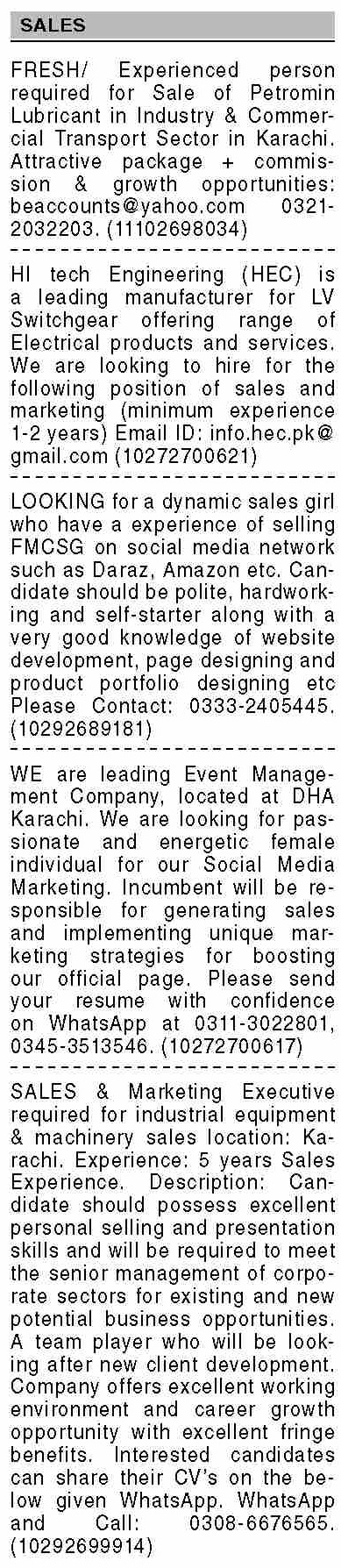 Vacant posts including marketing staff, sales girl, marketing officer, sales executive, sales officer, sales staff, marketing executive and event manager are announced in Marketing Company Karachi, karachi Sindh Pakistan as per 13 June 2022 advertisement in daily Dawn Newspaper. Preferred Education is Matric, Middle, Bachelor and Intermediate etc.