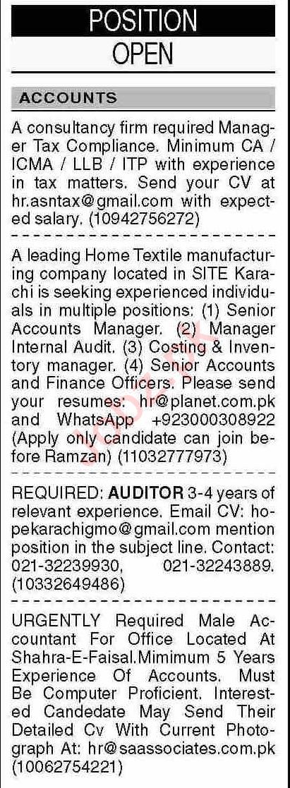 Private Company jobs advertisement dated about 13 March 2023 in daily Dawn Newspaper invites application for the vacant post of auditor, finance officer, inventory manager, accountant, accounts manager, manager internal audit, accounts officer, manager tax compliance and costing manager in Karachi, karachi Sindh Pakistan. Persons with Master, Bachelor and Intermediate etc. education can apply.