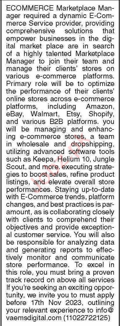 E Commerce Company jobs advertisement dated about 13 November 2023 in daily Dawn Newspaper invites application for the vacant post of manager and ecommerce marketplace manager in Karachi, karachi Sindh Pakistan. Persons with BA and Bachelor etc. education can apply.