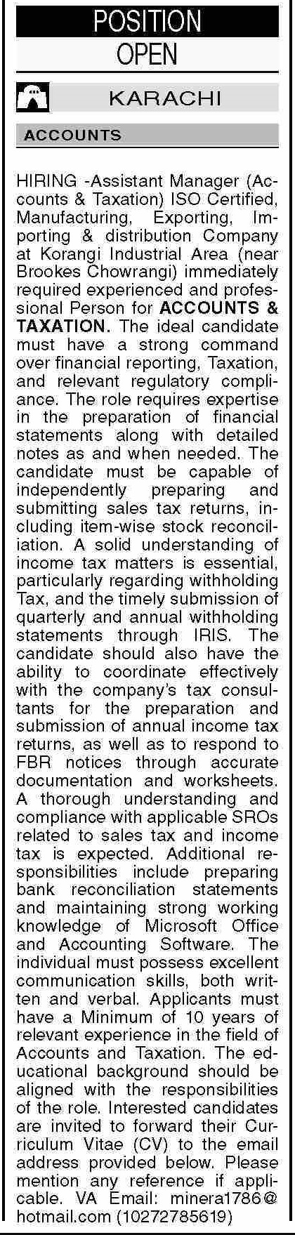 Private Company is looking for candidates for following posts as per job advertisement published in daily Dawn Newspaper of October 13, 2025 for location Karachi, karachi Sindh Pakistan: